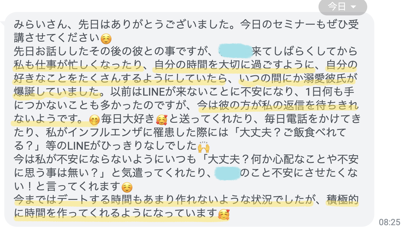 実際に実行してみた結果、「自分を愛する」ことがどういうことなのかわかり、また人生で初めて「自分から大好きになった人と付き合う」ことを叶えました。