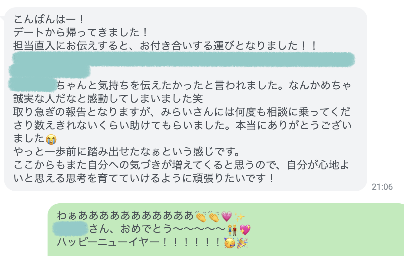 と感じるようなシチュエーションにもなりましたが、その度に相談してくれたので、アドバイスを届けた結果、実直に彼女が実践・行動していったおかげで見事、好きな彼と恋人同士になるということが叶いました!!